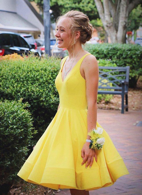 Yellow Knee Length Prom DressThe sunny dress is good for all-girl prom-goers. The sleeveless feature along with the length of the dress, complements all kinds of figures. White Knee Length Prom DressBlack Knee Length Prom Dress |