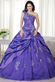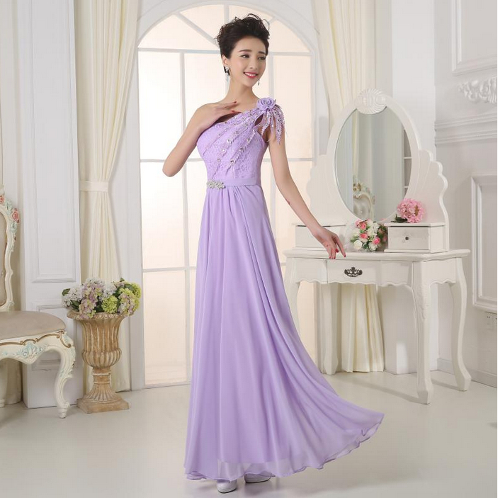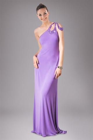 | You would look marvellous in an off-the-shoulder ball gown like the one shown below. Go forĀ earrings with a purple or lavender stone along with a matching necklace. This one-shoulder ruffled patterned gown would be a remarkable outfit choice to wear for your special day. You may make a beautiful tiara with lavender flowers to look unique. Your bridesmaid would look simply elegant in this pleated, one-shoulder long gown.